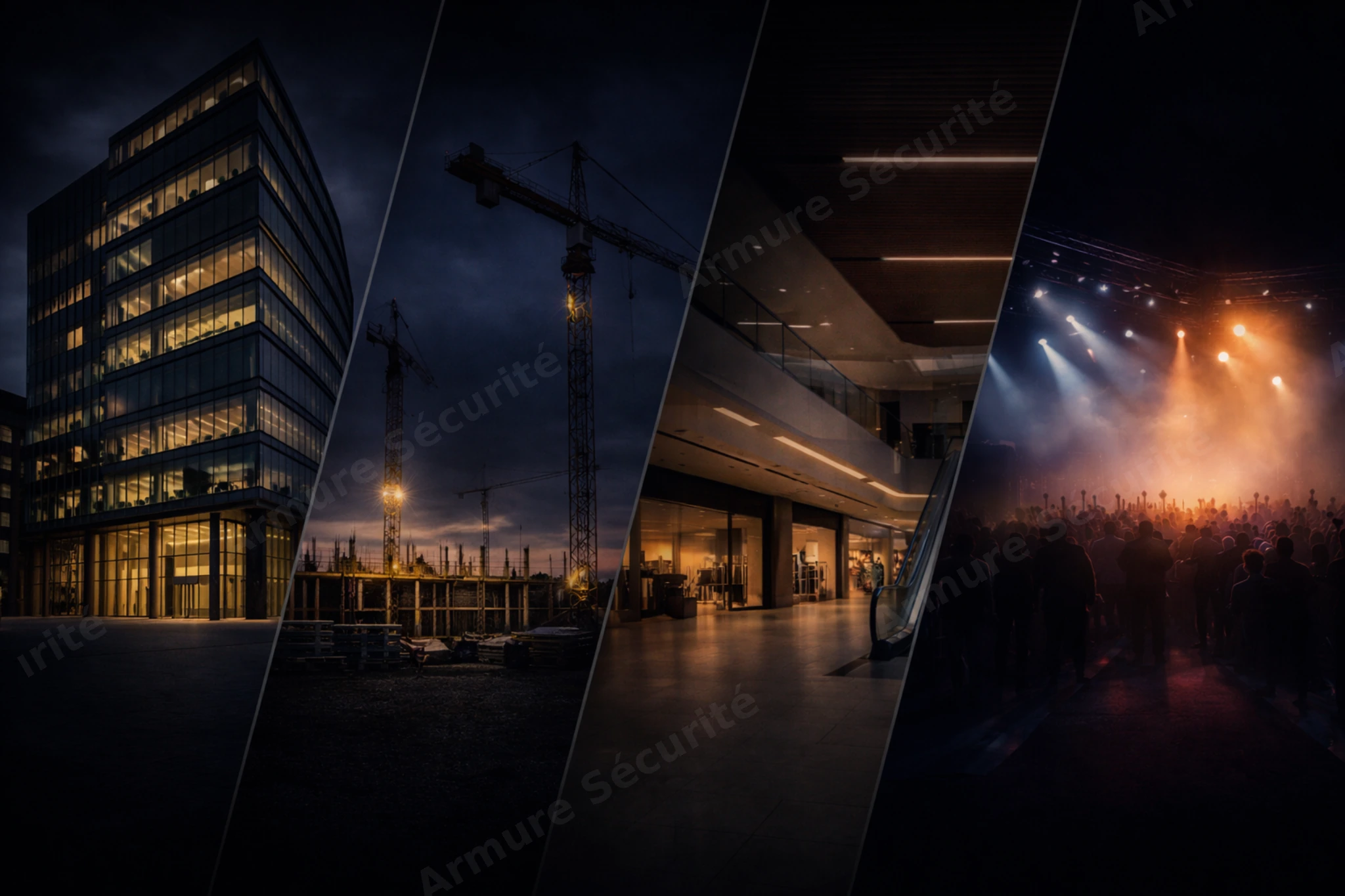 Nous intervenons notamment sur : bureaux/tertiaire, chantiers BTP, logistique/entrepôts/parkings, commerces & grande distribution, hôtellerie/boutiques premium, santé, et événementiel. Chaque secteur dispose d’une page dédiée.