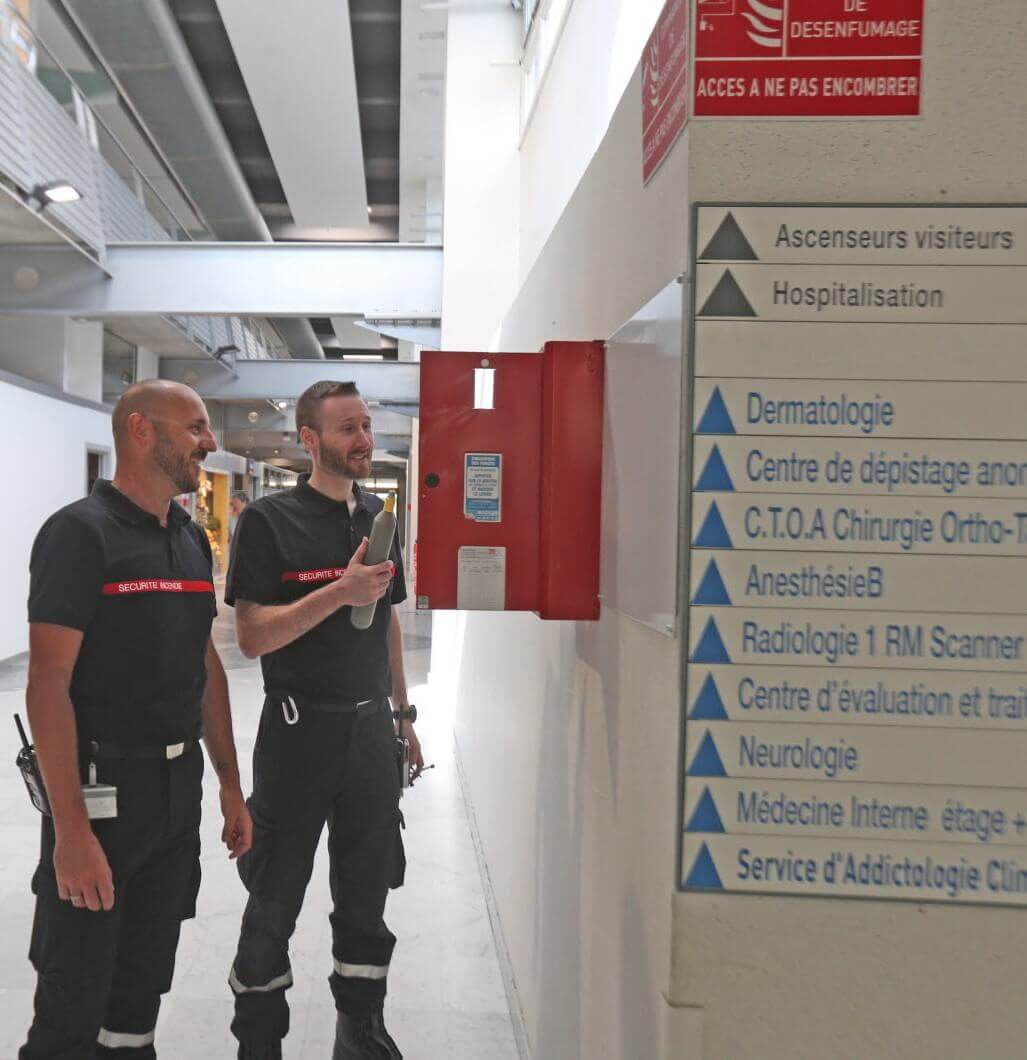 Sécurité hopital SSIAPPar admin / 4 juillet 2022 agent de sécurité SSIAP surveillent un hôpital, en veillant au système anti incendie