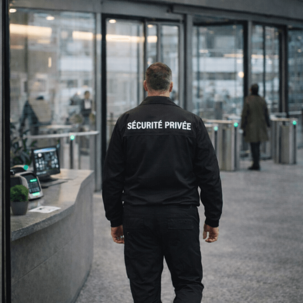 Agent de sécurité privée en environnement tertiaire assurant le contrôle d’accès, la surveillance des entrées et la sécurité des immeubles de bureaux.